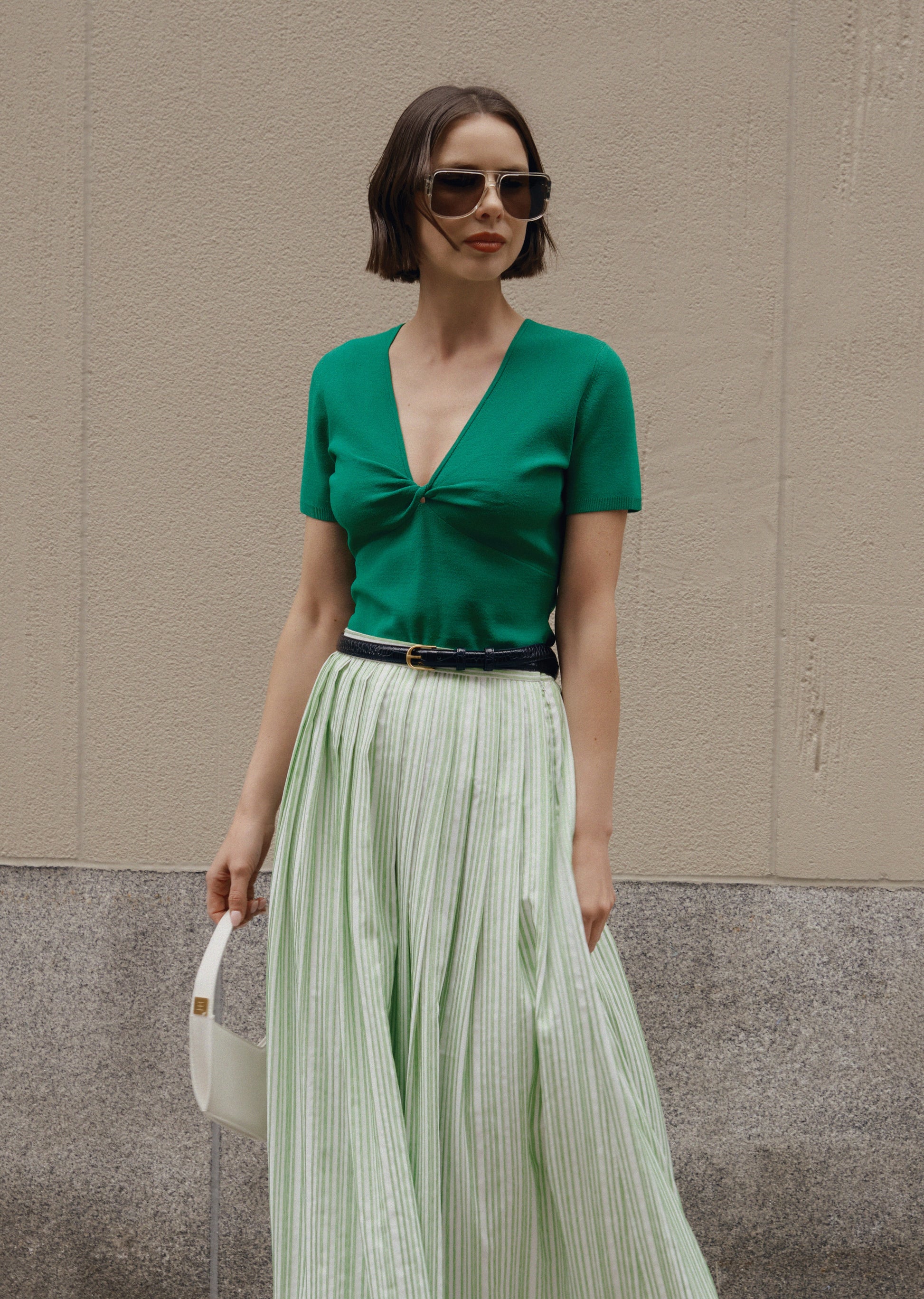 The Belle Twist Top is an elevated take on the classic tee, made from a soft, compact ribbed knit. It features short sleeves and a V-neckline that tapers elegantly into a front twist detail. Diagonal seams below the bust bring a flattering accent to the waist.