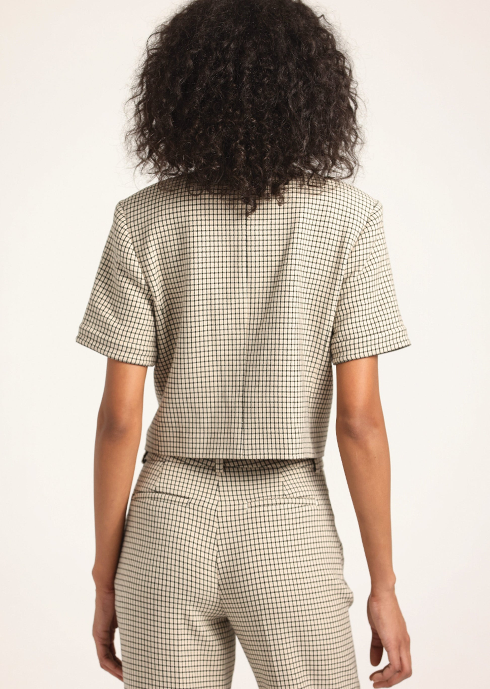 The Grace Short Sleeve Jacket is a subtly cropped style crafted from a wool blend. It features a short stand collar with gold dome logo buttons and front welt pockets. The soft tailored jacket features subtle vertical stripes and a fully lined interior.