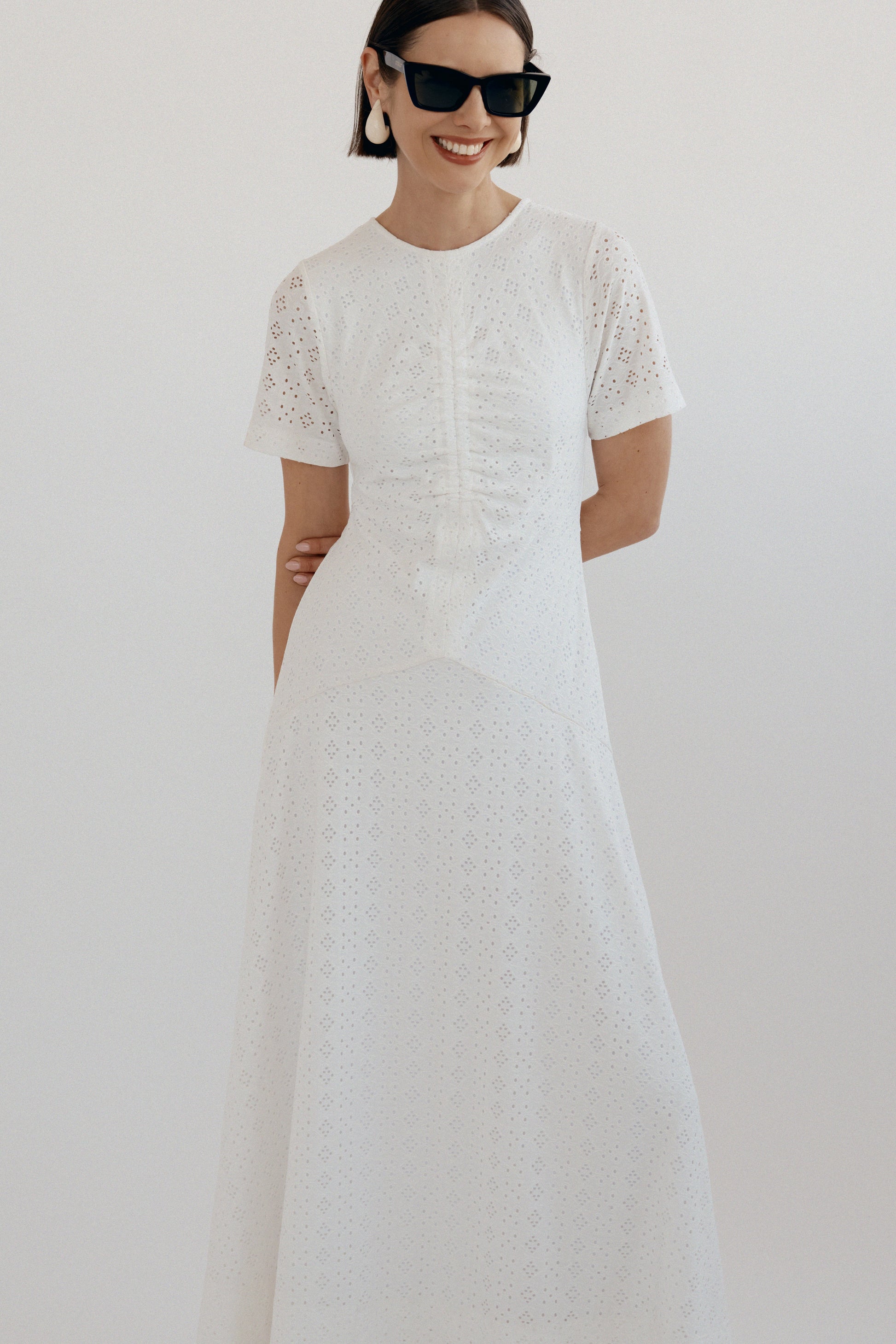 The Olympia Maxi Dress is crafted from soft knit eyelet and is fully lined for a sleek, smooth fit. Elasticated tunnels run down the center front, creating a gathering effect that gently cinches the mid-waist. The dress features t-shirt sleeves and a crew neckline for a sporty edge, while the tie keyhole back opening, finished with binding, and the flowy A-line silhouette add a feminine touch.