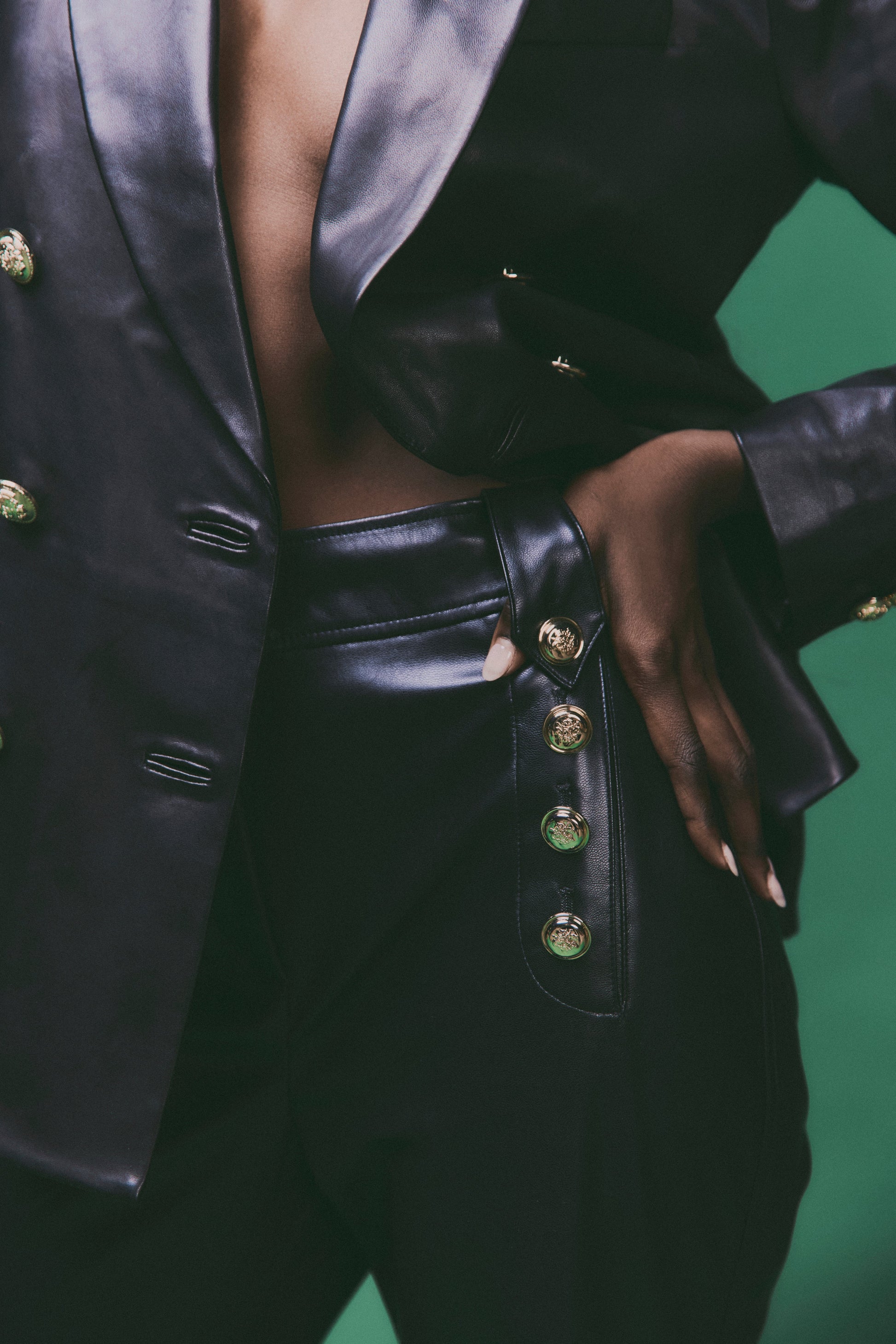 Our cult-favorite flared trouser with gold-tone sailor button details along the hips is updated this season in a luxe napa leather. Zip fly with button closure, flat front, tonal belt loops and stitching. Pair back to the leather Franklin jacket to complete the look.